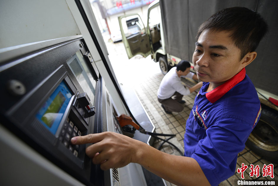 11月14日,海口市区某加油站的工作人员正在为市民加油。国家发改委当日发布消息表示,决定自11月15日零时起降低国内成品油价格,汽、柴油价格每吨分别降低160元和155元。中新社发 骆云飞 摄