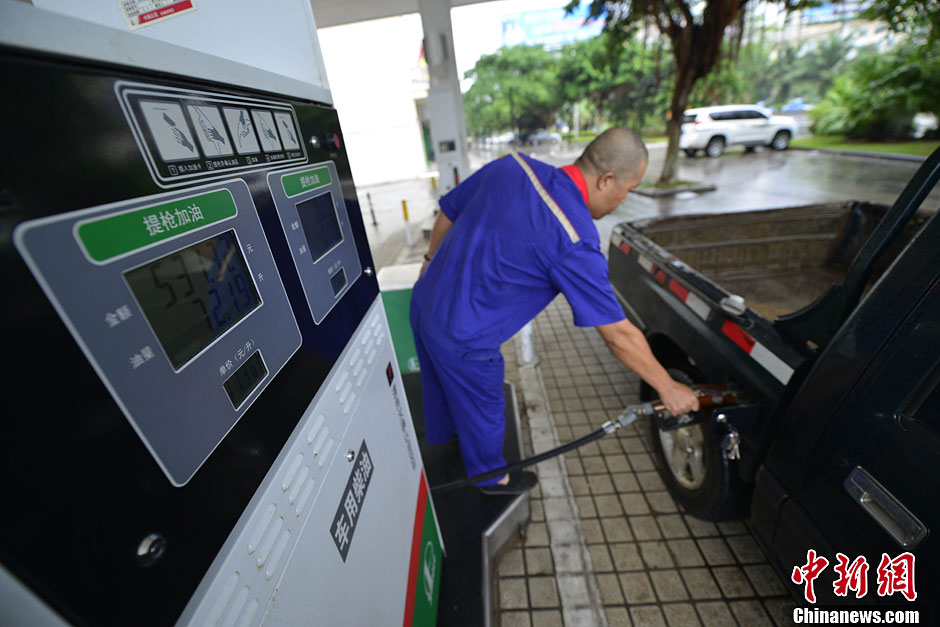 11月14日,海口市区某加油站的工作人员正在为市民加油。国家发改委当日发布消息表示,决定自11月15日零时起降低国内成品油价格,汽、柴油价格每吨分别降低160元和155元。中新社发 骆云飞 摄