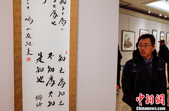 图为日本前首相鸠山由纪夫在今年3月写的一幅书法作品亮相该展览,内容是《论语》中的名句。为了体现中日友好关系,当时他专门将自己的名字写成了“鸠山友纪夫”。