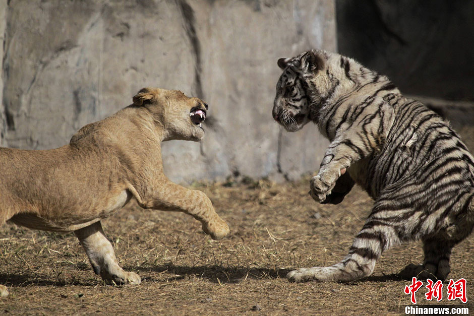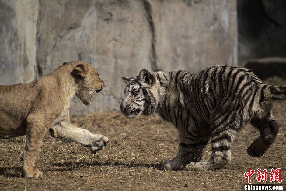 11月15日,河南郑州动物园“狮虎幼儿园”内,一只幼虎与一只幼狮为争抢地盘发生激烈争斗,吸引众多游客驻足观看。中新社发 王中举 摄