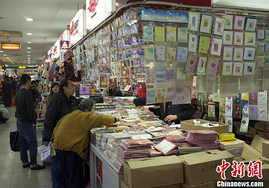 11月15日,北京某著名小商品批发市场内出售贺年卡的商铺门可罗雀。今年10月底,中纪委下发了“严禁公款购买印制寄送贺年卡等物品”的通知。中新社发 侯宇 摄