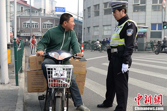图为上海市公安局黄浦分局交警支队民警对一位非机动车载物的市民进行教育。中新社发 赖鑫琳 摄