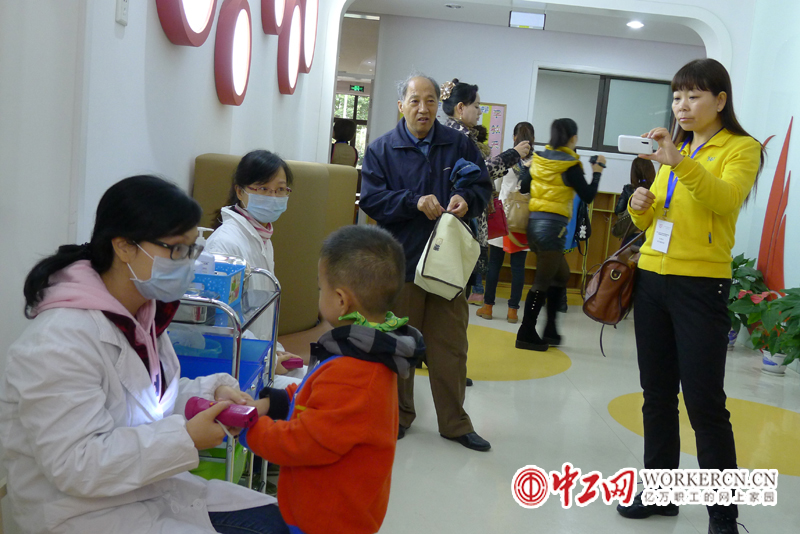 图为早上8时许,长宁幼儿园的保健老师为孩子们进行晨检,“一摸”、“二看”、“三问”、“四查”,晨检后,保健老师还将健康观察中发现的异常情况登记下来,与当班教师一起关注当日幼儿的情况。中工网记者于宛尼摄