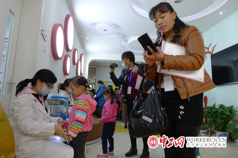 图为早上8时许,长宁幼儿园的保健老师为孩子们进行晨检,“一摸”、“二看”、“三问”、“四查”,晨检后,保健老师还将健康观察中发现的异常情况登记下来,与当班教师一起关注当日幼儿的情况。中工网记者于宛尼摄