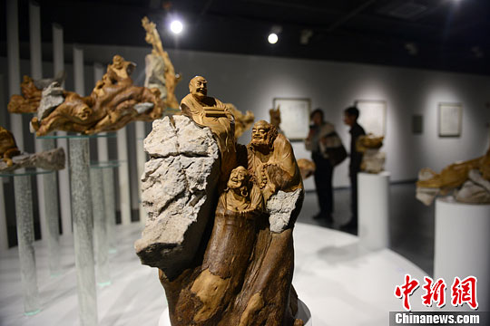 11月15日,四川首届工艺美术大师精品邀请展在成都举行,本次展会吸引了80余名中国优秀的工艺美术大师,568件工艺作品参展。图为展出的木雕版《十八罗汉》。