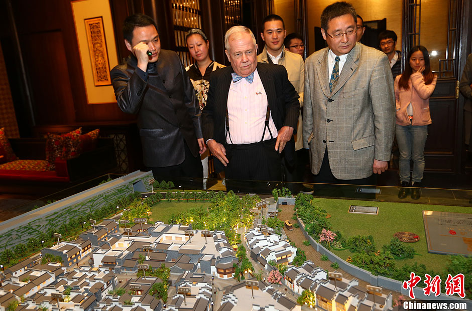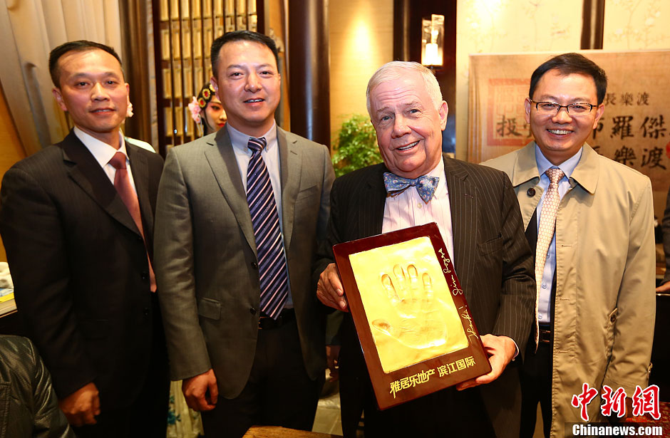 11月15日,前来参加“中国新经济力量峰会”的国际投资大师吉姆·罗杰斯抵达南京,在工作人员的陪同下登上画舫游览秦淮河、参观老城南长乐渡,穿越历史旧时光,感受六朝古都历史文化。图为罗杰斯在长乐渡留下掌印。