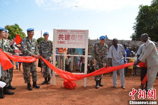 当地时间11月11日,中国第十一批赴南苏丹维和部队和达加特街区军民共建启动仪式在南苏丹第二大城市瓦乌举行。瓦乌市市长、政府官员、维和官兵代表和街区共300多人一起见证这一历史时刻。图为中国维和部队指挥官和瓦乌市长、市政府官员共同为共建活动揭牌。