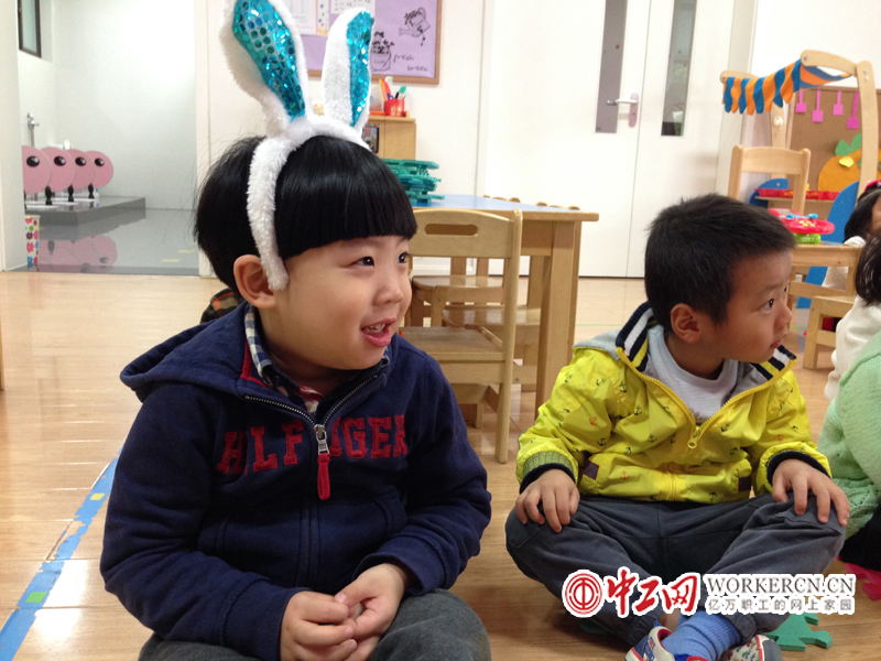 孩子们在幼儿园时期是培养良好生活习惯、文明礼仪的重要阶段。图为老师告诉孩子如何与客人打招呼,听见国歌要起立。中工网记者于宛尼摄