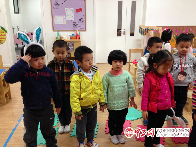 孩子们在幼儿园时期是培养良好生活习惯、文明礼仪的重要阶段。图为老师告诉孩子如何与客人打招呼,听见国歌要起立。中工网记者于宛尼摄