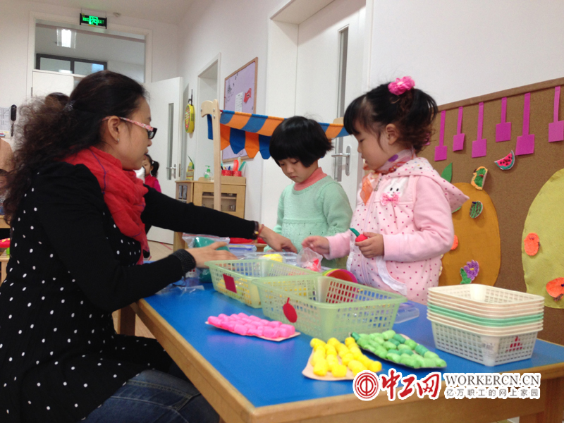 老师带着小班的小朋友做游戏、捏橡皮泥,孩子们在游戏活动中学会人际交流、突破害羞心理障碍。中工网记者于宛尼摄