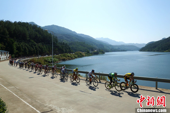 11月18日,环福州·永泰国际公路自行车赛结束了为期3天的赛程,最终来自台湾的中华台北RTS车队获得个人团体双第一。图为选手路过永泰水库。吕明 摄