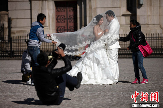 11月19日,青岛市浙江路天主教堂广场,一对对准新人在寒风中拍摄婚纱照片。初冬的青岛气温下降,但婚纱摄影生意却火了起来,穿婚纱披棉袄的奇景再现青岛街头。中新社发 徐崇德 摄