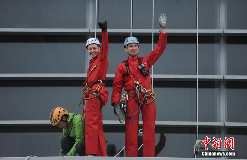 11月21日,2名外国攀岩运动员成功利用器械攀爬重庆高楼,攀爬高度为188米,向重庆市民传达勇攀高峰、奋斗不息的体育精神。中新社发 陈超 摄