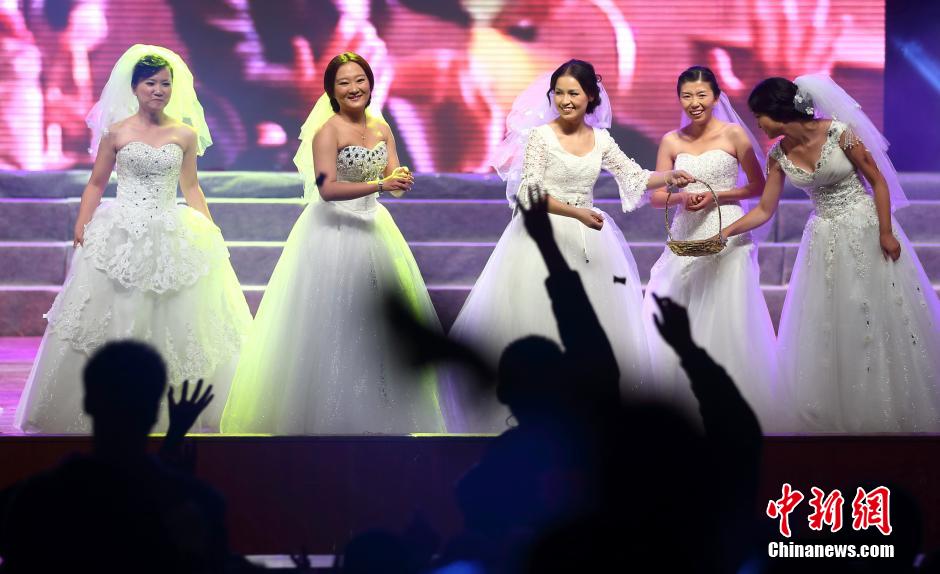 11月22日晚,南京东南大学五对辅导员老师在舞台上举行集体婚礼,接受大学生们的祝福。当日,持续两个月的“2013年东南大学新生文化季”在九龙湖小区举行闭幕式暨新生文艺汇演,以“梦想从东大启程!”为主题,结合中国梦和爱国爱校的教育,上演凝聚新生智慧与创意的节目,吸引了众多大学生前来分享充满青春活力、饱含文化气息与人文精神的文化大餐。中新社发 泱波 摄