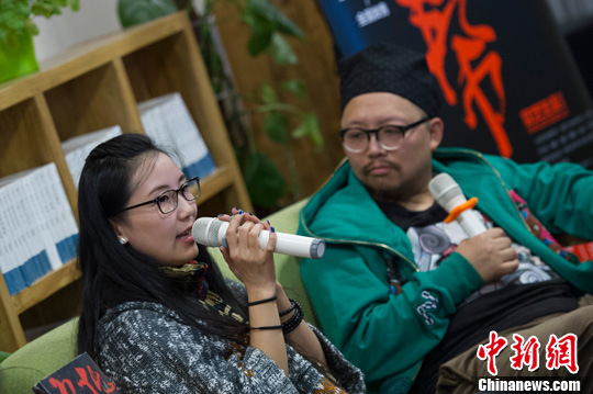 11月24日,《文艺生活周刊》总编米拉拉,著名编剧兼策划人史航携《文艺生活周刊》100期精华合集——《乌托有个帮》在北京与读者见面。图为米拉拉、史航在读者见面会与读者交流。中新社发 崔楠 摄