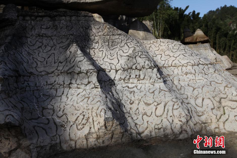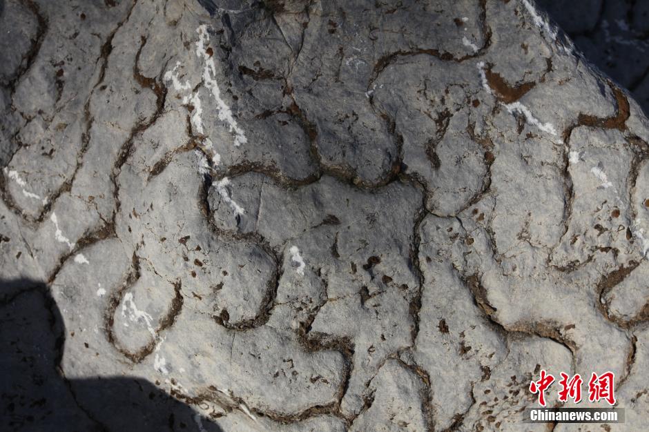 11月25日,记者从四川省长宁县旅游局获悉,该县梅硐镇的竹石林旅游景区在进行升级扩建时,发现了许多埋藏在地下数亿年的“豹皮纹灰岩”。“豹皮纹灰岩”,也称“龟裂纹灰岩”(形状像龟背上的裂纹),因为在石灰岩上布满了繁多复杂的环纹构造,这些环纹构造恍若豹子皮上的花纹,故称“豹皮纹灰岩”。新发现的这些“豹皮纹灰岩”出露地表后,白色的灰岩上的环纹构造非常清晰明显。图为灰岩上的豹皮纹理。中新社发 刘龙泉 摄
