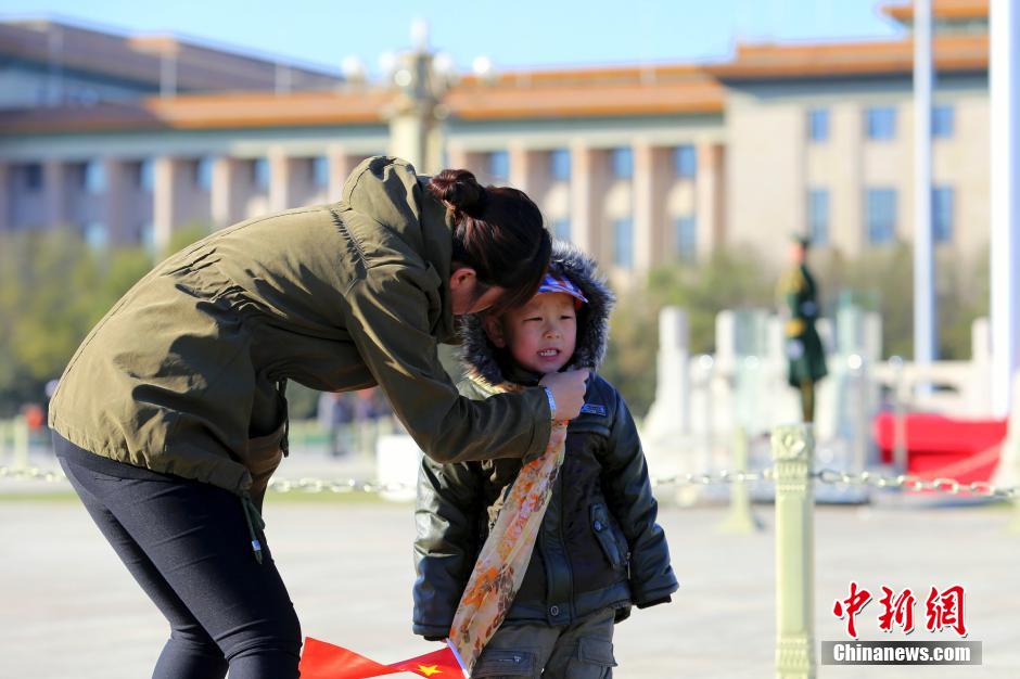 寒潮袭扰北京 游人“顶风”参观天安门广场