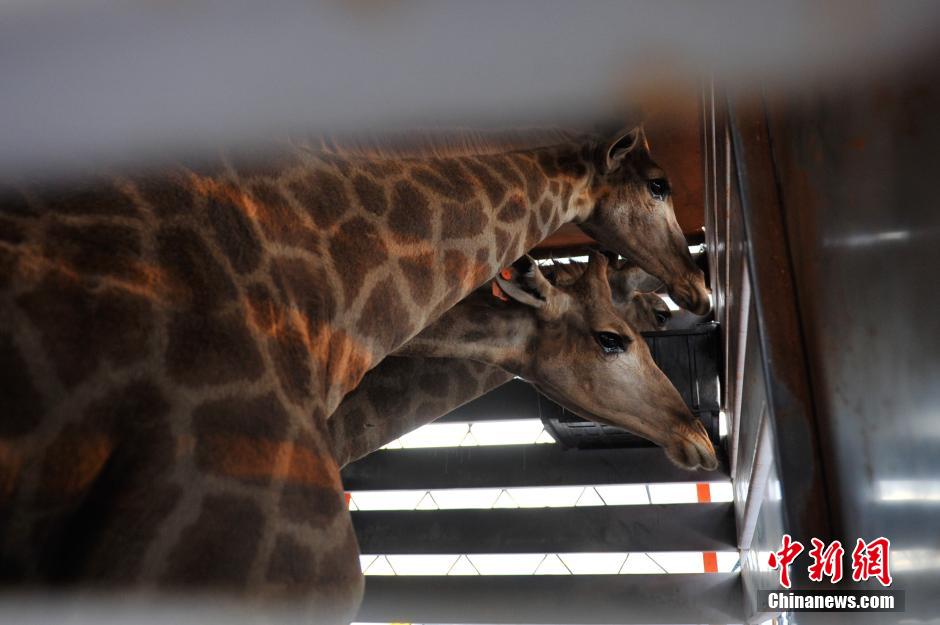 11月26日,载有长颈鹿的卡车。当日,从南非约翰内斯堡乘坐专机长途跋涉而来的23头长颈鹿在昆明长水国际机场安全着陆,历经17个小时的奔波终于成功“移民”昆明,落户云南野生动物园。中新社发 刘冉阳 摄