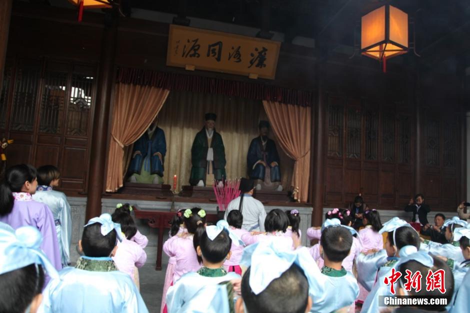 图为学童敬拜朱子圣人。朱熹(1130-1200年)中国南宋思想家。字元晦,号晦庵,徽州婺源(今属江西)人。王剑 摄