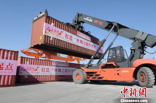 11月28日,西安新筑车站内正在进行运往哈萨克斯坦阿拉木图的集装箱作业。张远 摄