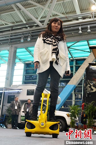11月29日,工作人员正在展示一款智能“机器人”代步车。当日,2013海峡两岸品牌博览会在江苏苏州举行,一款智能“机器人”代步车一亮相,便吸人眼球,引来民众围观。中新社发 王思哲 摄
