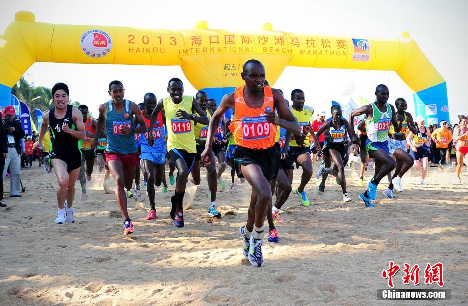 11月30日下午,2013海口国际沙滩马拉松在海口西海岸假日海滩起跑,来自中国、美国、肯尼亚、埃塞俄比亚、哈萨克斯坦、俄罗斯、乌克兰等21个国家的402名马拉松专业及业余选手和近2000名迷你马拉松爱好者参赛。中新社发 张茜翼 摄