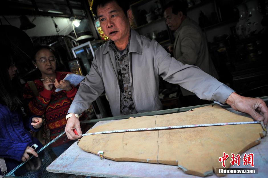 12月1日,广西骆越文化研究会在南宁向广西隆安县文物部门移交一块有数千年历史的“大石铲”。据介绍,这块长77厘米、宽41厘米,厚2厘米的“大石铲”近期在广西隆安乔建镇被农民发现,广西骆越文化研究会会长谢寿球判断其不存在造假的痕迹,系目前国内发现的最大石铲,约为6000年前祭祀所用。图为大石铲。中新社发 洪坚鹏 摄
