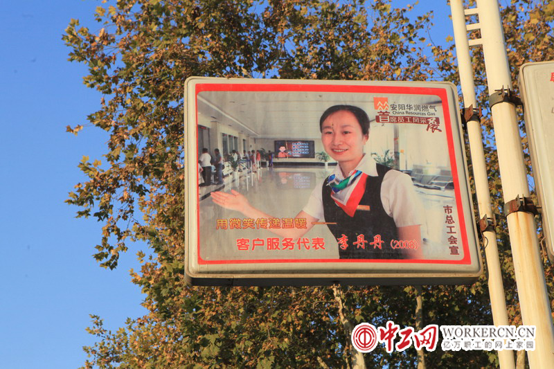 10月27日,中工网记者赴河南省安阳市进行采访报道,在市中心解放大道灯箱宣传栏上悬挂的劳动模范照片引起了记者的注意。全国五一劳动奖章获得者吴芳云,一人脏换来万家净;全国五一劳动奖章获得者王生英,山村孩子的希望;农民发明家、全国劳动模范吕胜战;林州钢铁大王、全国劳动模范李广元……