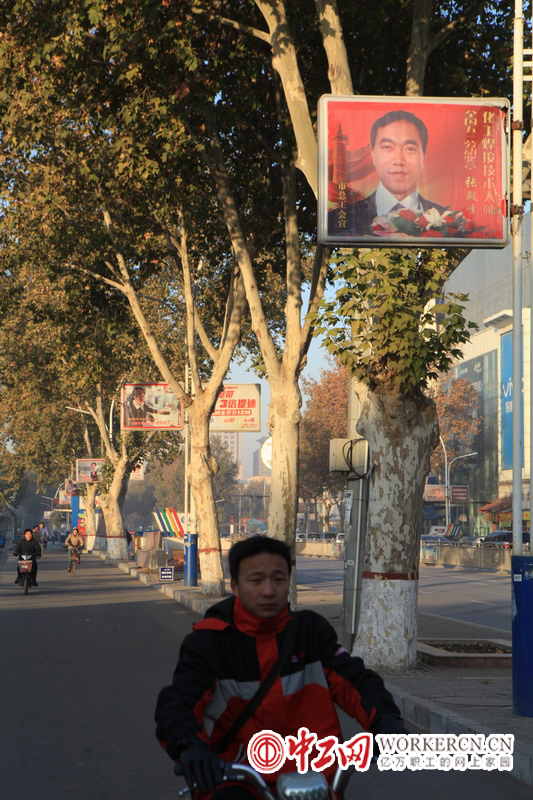 10月27日,中工网记者赴河南省安阳市进行采访报道,在市中心解放大道灯箱宣传栏上悬挂的劳动模范照片引起了记者的注意。全国五一劳动奖章获得者吴芳云,一人脏换来万家净;全国五一劳动奖章获得者王生英,山村孩子的希望;农民发明家、全国劳动模范吕胜战;林州钢铁大王、全国劳动模范李广元……