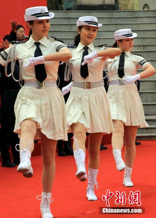 12月2日,上海举行“摒弃交通陋习,安全文明出行”宣传活动,靓丽的女交警用歌舞来助推活动。中新社发 潘索菲 摄