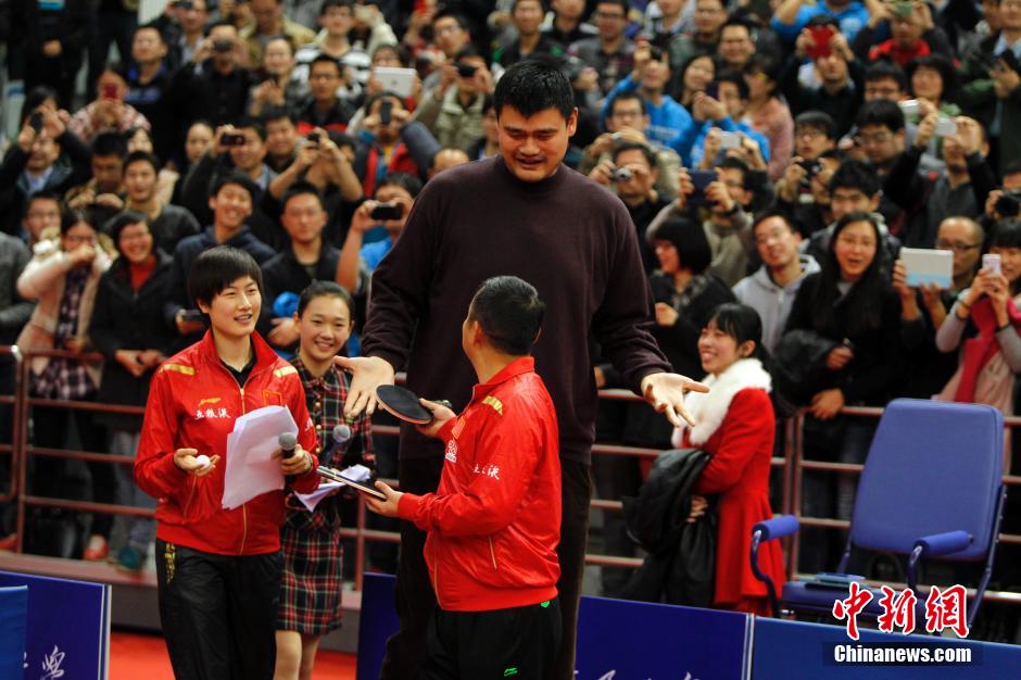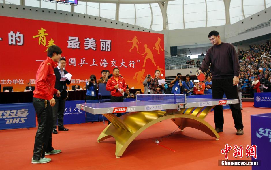 12月3日,国家乒乓球队总教练刘国梁率领众队员在上海交通大学参加“国乒上海交大行”活动。身为交大学生的姚明也特意前来助阵,并在现场与乒乓世界冠军们切磋球技。中新社发 汤彦俊 摄