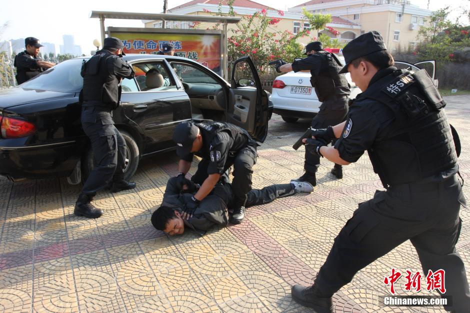 为提高铁路民警反恐处突应急能力,厦门铁路公安处于近日举办了反恐处突应急队培训班,重点训练了实弹射击、队列操练、警务技能、擒敌拳和处置突发事件战术运用等专业科目。厦门铁路公安处辖内厦门、泉州、龙岩和漳州四个地区40余名民警参与培训。图为培训课程结束后,反恐处突应急队进行汇报演练,应急队队员先后进行了射击、警务技能、擒敌拳、处置“武疯子”、处置犯罪嫌疑人在公共场合自焚危害公共安全、车辆拦截等科目的演练。林艺静 摄
