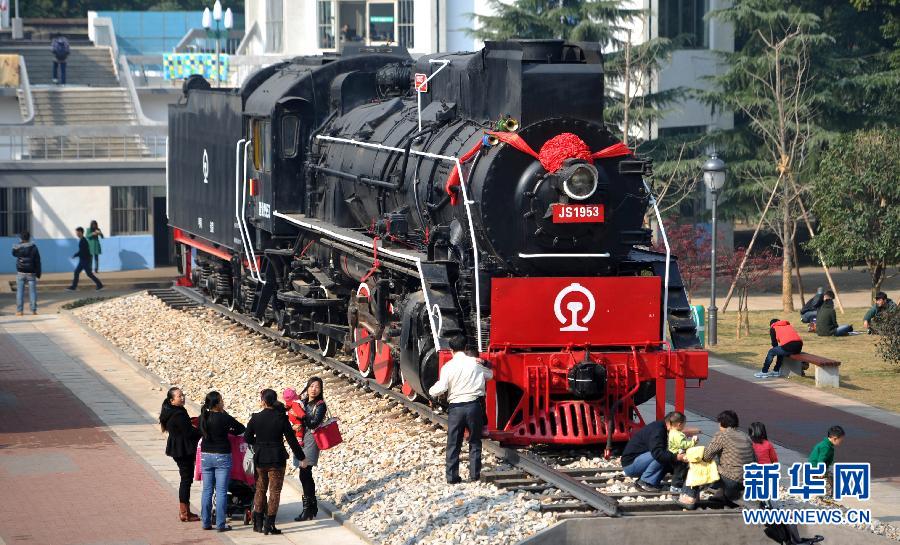 中南大学铁道学院内拍摄的建设型蒸汽机车(12月4日摄)。为纪念原长沙铁道学院组建60周年,三节“古董级”火车头近日被安放在位于长沙的中南大学铁道学院内。三节火车头分别代表中国火车发展史上曾经历的蒸汽机车、内燃机车、电力机车的几个阶段,浓缩了新中国机车发展的历史。新华社记者 李尕 摄