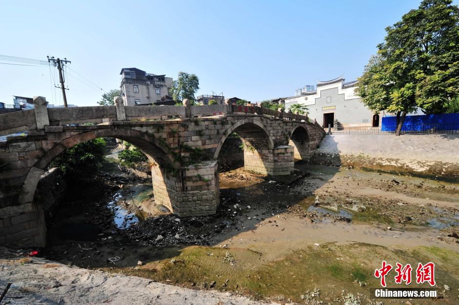 近日,福州台江上下杭街区的居民开始搬迁,福州上下杭历史文化街区保护改造全面开始。图为建于清嘉庆年间的三通桥,是三捷河上保存最完好的最大石拱桥。中新社发 张斌 摄