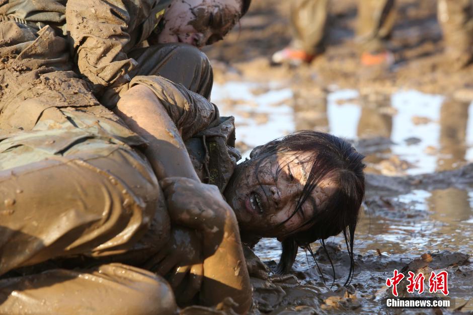 12月4日,北京顺义,天骄保镖训练营迎来北京可鑫汽车公司的20多名白领,开始为期2天的拓展训练。据了解,此次白领们参加的拓展训练项目将与基地内正在进行中的保镖训练项目合并,白领与准保镖一同完成高强度的特训项目。图为正在进行涉水项目的女白领。中新社发 杨阳 摄