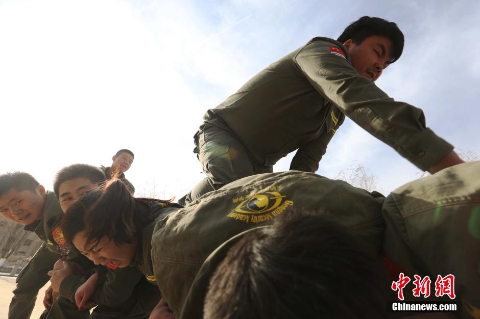 12月4日,北京顺义,天骄保镖训练营迎来北京可鑫汽车公司的20多名白领,开始为期2天的拓展训练。据了解,此次白领们参加的拓展训练项目将与基地内正在进行中的保镖训练项目合并,白领与准保镖一同完成高强度的特训项目。图为正在过“人桥”的白领。中新社发 杨阳 摄