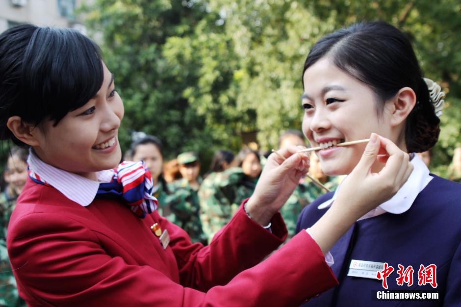 厦深铁路将于近期投入运营。为备战厦深线动车开通,南昌铁路局福州客运段抽调50多名有乘务工作经验的乘务员,并从东北、四川等省招聘百名新乘务员,开展理论业务、服务技能、礼仪和实作培训。图为海西动姐服务技能训练场景。雍万俊 摄