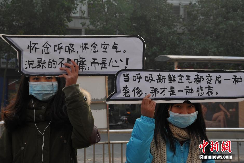12月9日,大学生在街头进行“无声抗议”,呼吁市民保护环境。当日,安徽农业大学“绿色家园”环保协会联合五里墩街道财经科志愿者,在街头进行“命运共同体”、“捐赠空气”、“无声抗议”等三组静态行为艺术表演,以此来唤起市民对于雾霾天气的重视以及环境保护的意识,从而投身到防治雾霾的行动当中。中新社发 韩苏原 摄