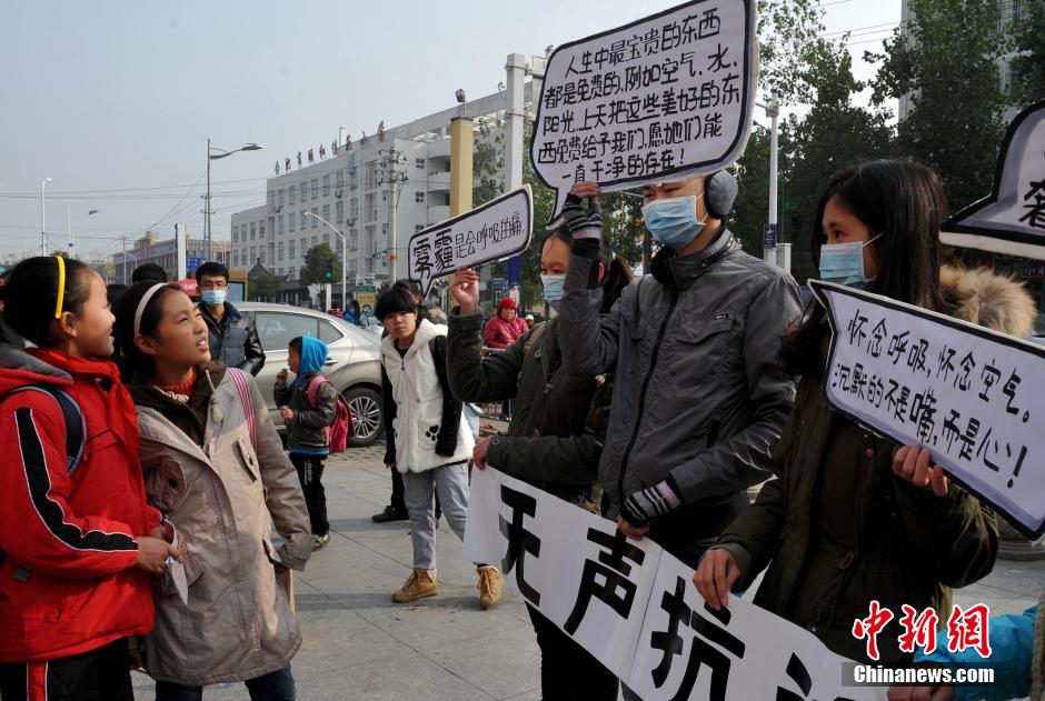 12月9日,大学生在街头进行“无声抗议”,呼吁市民保护环境。当日,安徽农业大学“绿色家园”环保协会联合五里墩街道财经科志愿者,在街头进行“命运共同体”、“捐赠空气”、“无声抗议”等三组静态行为艺术表演,以此来唤起市民对于雾霾天气的重视以及环境保护的意识,从而投身到防治雾霾的行动当中。中新社发 韩苏原 摄