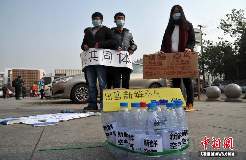 12月9日,一位孩子看到装满“新鲜空气”的瓶子露出笑容。当日,安徽农业大学“绿色家园”环保协会联合五里墩街道财经科志愿者,在街头进行“命运共同体”、“捐赠空气”、“无声抗议”等三组静态行为艺术表演,以此来唤起市民对于雾霾天气的重视以及环境保护的意识,从而投身到防治雾霾的行动当中。中新社发 韩苏原 摄