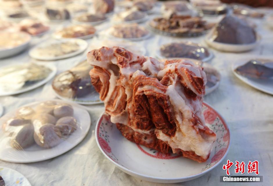 12月9日,在南京举办的奇石展上,一桌石头宴格外吸引参观者的目光,108道用各种天然石头组成的“菜肴”令人垂涎,从“肉类”到“蔬菜”、从“凉菜”到“炒菜”一应俱全。泱波 摄