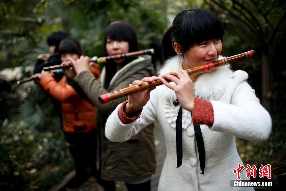 12月9日,来自连云港的考生们在考场外练习乐器。当日,江苏省2014年普通高校招生音乐专业统考面试在南京师范大学举行,艺考大幕由此拉开。艺术院校的招生考试一直是追逐艺术梦想的年轻人亮相的热闹舞台,竞争十分激烈。据悉,中国教育部今年年初下发了《艺术学门类专业招生工作的指导意见》(征求意见稿),拟从2014年起,提高艺术类招生文化课的控制分数线。其中,美术类本科专业学生的文化课控制分数线,不能低于同批次普通文理科考生文化成绩的70%;音乐专业学生不能低于同批次普通文理科考生文化成绩的65%。中新社发 泱波 摄