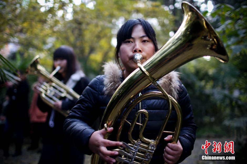12月9日,来自淮安的考生在考场外练习乐器。中新社发 泱波 摄