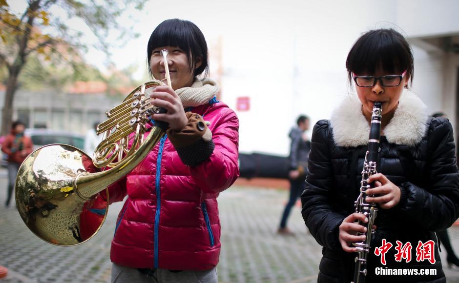 12月9日,来自宿迁的考生们在考场外练习乐器。中新社发 泱波 摄