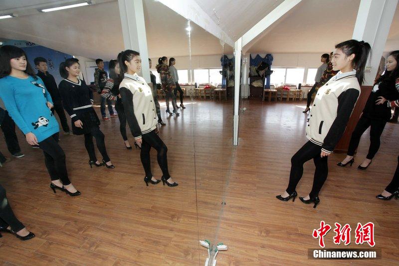 在山东省潍坊市区一家艺考培训学校内,“模特”们正在加紧训练。为了备战2014年艺考,来自潍坊市区的近百名高三学子聚集在这个集训班上,进行形体、舞蹈、化妆、表演等科目的训练,迎接2014年高考模特专业及空乘等专业的考试。图为“模特”们正在加紧训练。张驰 摄 图片来源:CFP视觉中国