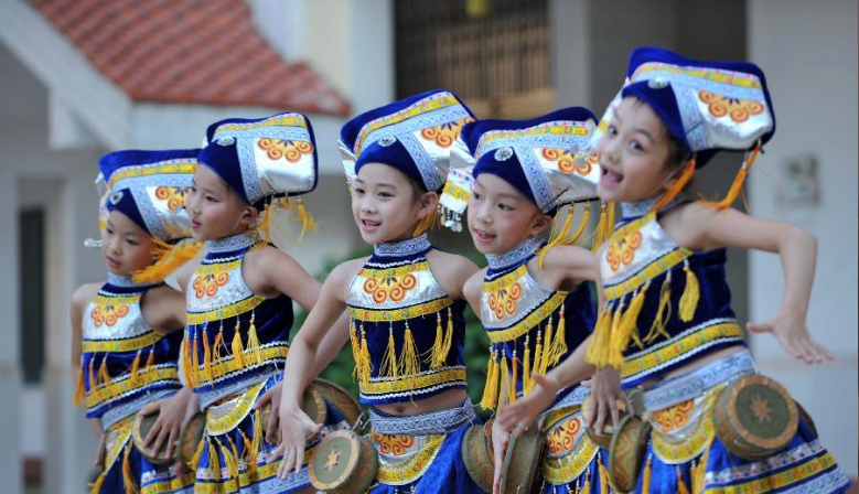 12月4日,在广西南宁市扶壮学校,孩子们在表演舞蹈《快乐鼓娃》。当日,2013年南宁市“民族风情进校园”活动在以进城务工人员子女为主要生源的扶壮学校举行。南宁市青少年活动中心的小演员们和扶壮学校的学生同台表演民族文艺节目。新华社记者 周华 摄
