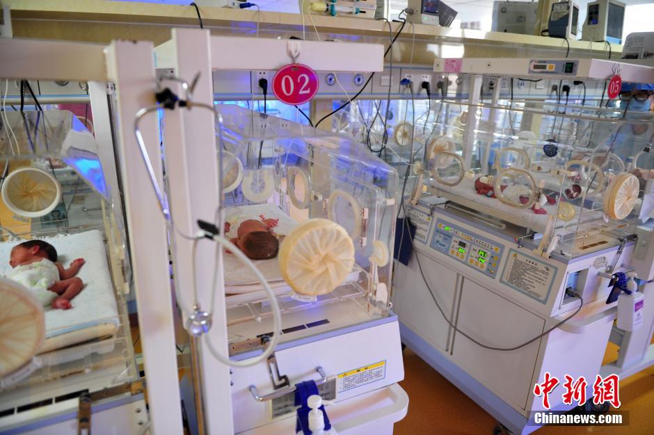 12月3日下午,河北石家庄第六医院新生儿科,医护人员正在照顾保温箱内的四个女婴。医院表示,26岁的“80后”妈妈安月红近日自然分娩产下的四千金体重分别为1400克、1500克、1200克、1050克,目前小宝宝情况基本平稳。据了解,四胞胎在国内非常罕见。中新社发 翟羽佳 摄