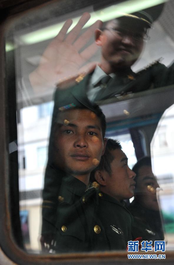 武警云南边防总队的退伍老兵在昆明火车站与战友依依惜别。近日,驻滇武警、解放军部队的退伍老兵们纷纷在战友的欢送下,辞别营房,踏上回家的路途。 新华社记者 蔺以光 摄