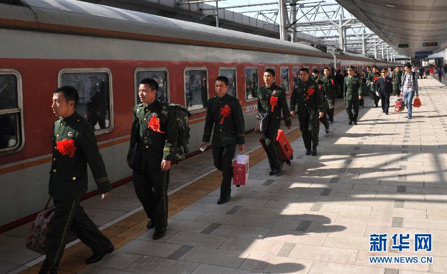 武警云南边防总队的退伍老兵在昆明火车站与战友依依惜别。近日,驻滇武警、解放军部队的退伍老兵们纷纷在战友的欢送下,辞别营房,踏上回家的路途。 新华社记者 蔺以光 摄