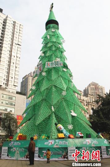 12月12日,重庆商圈内摆巨型圣诞树吸引市民参观。圣诞节临近,重庆日月光广场,商家用数万个塑料空瓶搭建了一棵高30余米的巨型圣诞树,圣诞树与城市建筑交相辉映,营造出浓浓的圣诞氛围。